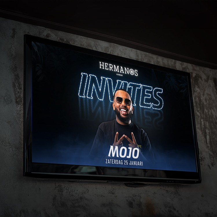 Voor Hermanos ontwerpen we dynamische social media stories en visuele content voor digitale schermen in de club. Met sterke, herkenbare designs zorgen we dat aankondigingen, events en highlights direct opvallen zowel online als op locatie.